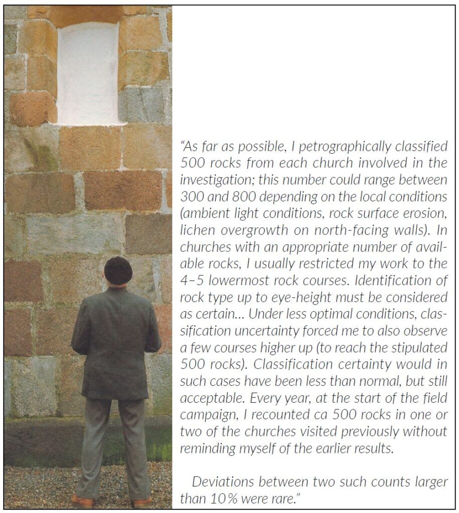 And now the story gets historical. The field sampling part (gathering the local surface rocks from the landscapes in Jutland) was undertaken by the original medieval church builders, who, with absolute certainty, were inspired and driven by very different motivations than science—masonry has it origin in the religious wish to build churches in which to worship. It was Arne Noe-Nygaard’s inspired geological brilliance to make explicit this hidden sampling aspect of medieval church building.1,2 Sampling by religious proxy! Thus, each medieval church takes on the role as a (rather large) sample of local landscape boulders, the size of which amounts to the cumulative wall area of the lowermost 5‒7(8) rock courses. In passing (a treat for TOS experts), one observes that samples of this type are comprised by very, very large “particles”, making it imperative to be able to obtain a large enough square footage—the stated minimum of ca 500 rocks (see magazine front cover for a deliberate pointed focus).