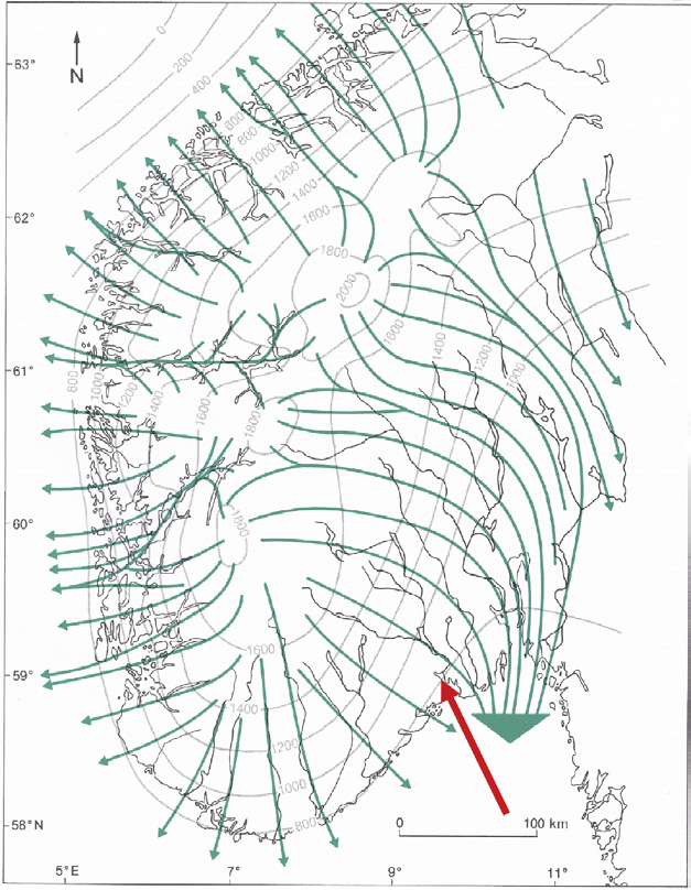 To close the geological part of the story, Figure 8 shows the most recent ice age glacial flow direction patterns in southern Norway. For the reader not familiar with the geography and Quaternary geology of Scandinavia, Denmark is situated some 200 km south of the Norwegian glacial flow field shown. Herewith the connection between identifiable, diagnostic erratics from the area surrounding Larvik in southern Norway and medieval church rock assemblages in Jutland, Denmark, should be fully established and understandable for all, no specialised geological competence needed.