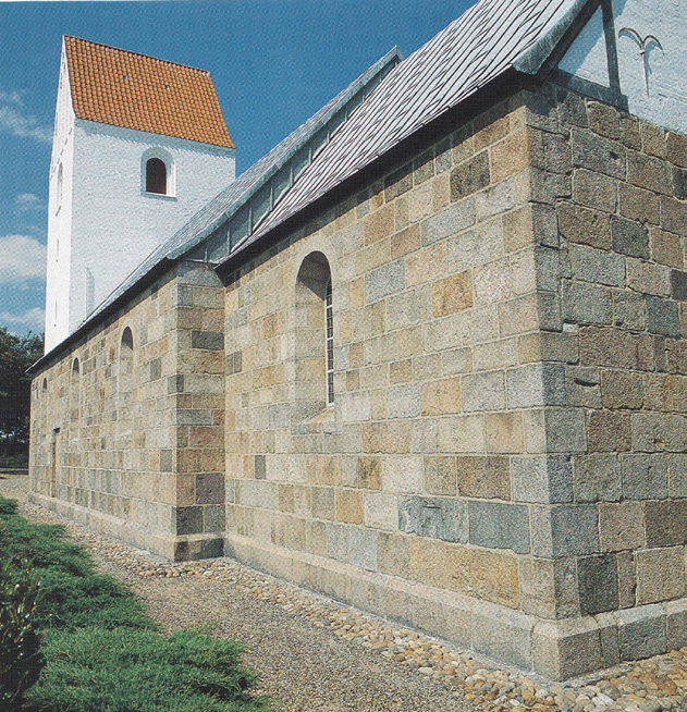 The Romanesque hewn rock churches in Jutland were constructed in the period 1100‒1200. There are still some 700 of them in a reasonably wellpreserved state. In fact, this type of church is rather unique for the northern and western parts of Jutland, hardly found anywhere else in the world.1,2 It is the professional historical view that the source for the rocks used for the original church building is local, i.e. they represent the surrounding landscape from where they were transported as short distances as possible before being hewn, probably at the church site. It is easy to compensate for later alterations and additions regarding improvements and modifications often with a distinct later architectural style, e.g. as seen in Figures 2 and 3 (enlargement of windows, lead roofing and addition of a bell tower). Compensating for this, the geologist Noe-Nygaard shared the belief that most of the original church walls in northern and western Jutland represent a wellpreserved sample of the local rocks found on the surface at the time of building.