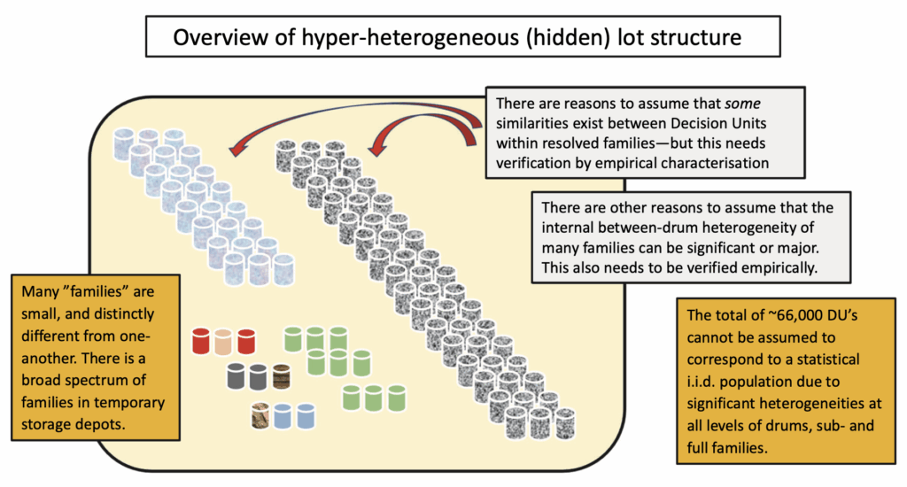 It would have been nice if the ~66,000 drums could be viewed as one statistical population consisting of i.i.d. DUs with a known distribution between DUs (In the nuclear waste realm, often waste drums may even have their own internal heterogeneity, i.e. containing 1, 2 or 3 compressed units (called “pucks”), which may then better reflect the optimal resolved DUs of interest, depending on the specific WAC analytes proscribed. For simplicity in this didactic exposé of statistical methodology however, we here stay with DUs being synonymous with drums.). But because of the 50-year complex decommissioning history it is known that low-level nuclear waste drums not only differ extremely in compositional content(s), physical constitution and radioactivity profiles, but—horror-of-horrors from a statistical point of view—there are very good reasons to infer that there exist groupings within this population of 66,000 DUs. But the degree to which such groupings (“families” in the nuclear expert lingo) are well characterised and well discriminable inter alia, is markedly uncertain; some families are suspected to be clearly demarked, but certainly not all, or maybe not even most.