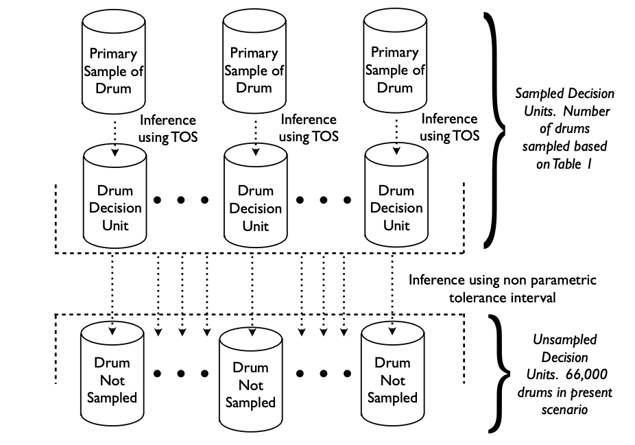 So far, diligent archival work has resulted in identification of some 40+ “families” or so, each with broadly similar radioactivity profiles. It is relatively easy to measure a radioactive profile fingerprint of an individual drum.4 Due to the marked heterogeneity hierarchy (drums – families – meta-population), Figure 1, it was at one time tentatively decided to try to use “resolved families” as DUs, rather than the entire lot, as laid out by Ramsey.3 The main statistical issue then was whether it was possible to estimate how many drums would be needed to characterise (or validate) each family with a desired low “statistical uncertainty”. Further comprehensive problem analysis, however, made it clear it was necessary to increase the observation resolution to focus on individual drums as the final operative DUs.