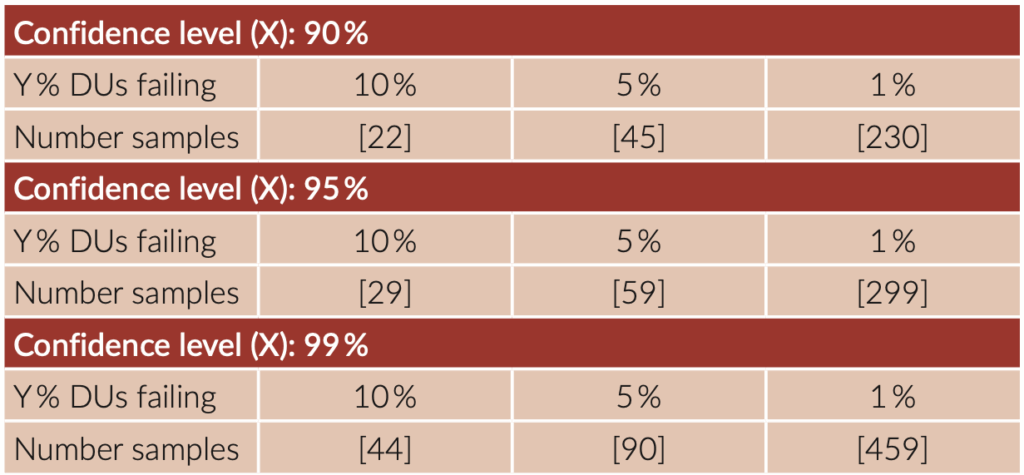 Table 1 shows the evergreen question raised when seeking help from statistics: “how many” observations or measurements are needed in this generic non-parametric approach, presented for a few typical cases i.e. (90, 95, 99 %) confidence that no more than (10, 5, 1 %) DUs could be failing. The smallest vs the largest necessary number of samples needed to allow this test regimen could be from