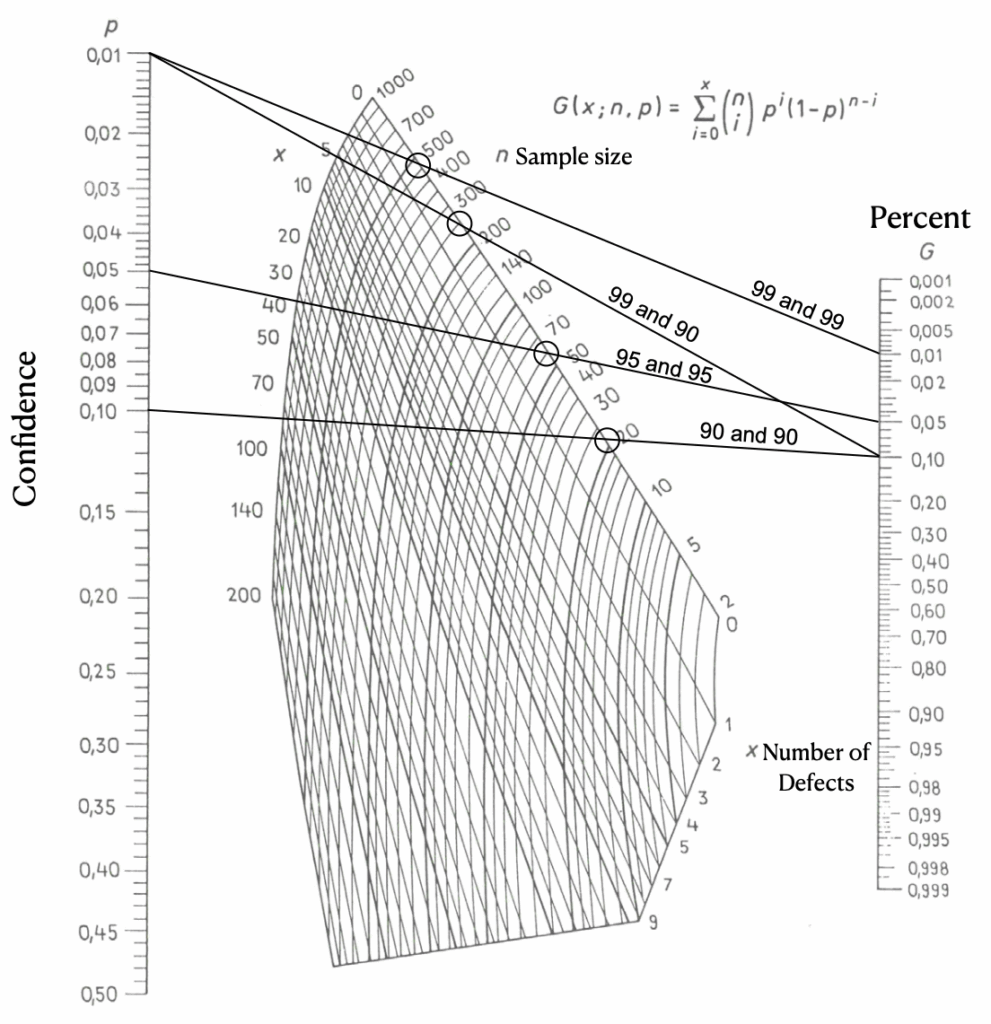 The Larson nomogram (Figure 5) can be used to obtain the required sample numbers presented in this paper. This nomogram was developed in 1966, long before the proliferation of computers, and is based on the binomial distribution. To use the nomogram, draw a line from the desired “confidence” to the “percent” one is willing to allow to fail. The intersection of that line to the line of “n Sample size” gives the necessary number of samples to inspect. With this methodology, an exact determination is impossible, but readings from the nomogram are consistent with calculated values.