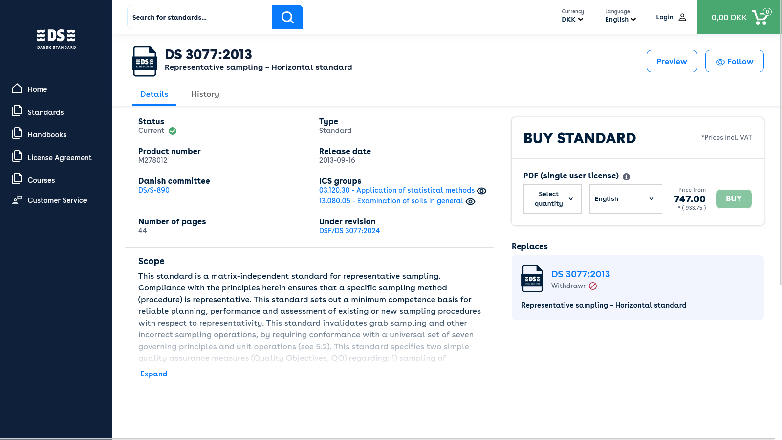 This standard is a matrix-independent standard for representative sampling, published by the Danish Standards Foundation. This standard sets out a minimum competence basis for reliable planning, performance and assessment of existing or new sampling procedures with respect to representativity. This standard invalidates grab sampling and other incorrect sampling operations, by requiring conformance with a universal set of six Governing Principles and five Sampling Unit Operations. This standard is based on the Theory of Sampling (TOS).
