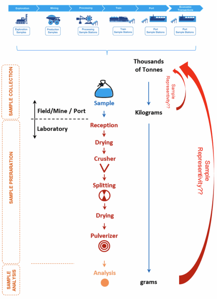 In the mining sector, decisions and investments in exploration, infrastructure construction, mining operations, ore processing and transportation require multi-million dollar capital and operating budgets, but critical decisions can be based only on very small samples (of the order of a few grams) that are supposed to represent thousands of tons. It is clear that the compound, complex lot-to-analysis pathway must be representative in all stages, Figure 1. The Theory of Sampling (TOS) is a self-evident element in the full Quality Management (QM) scope.