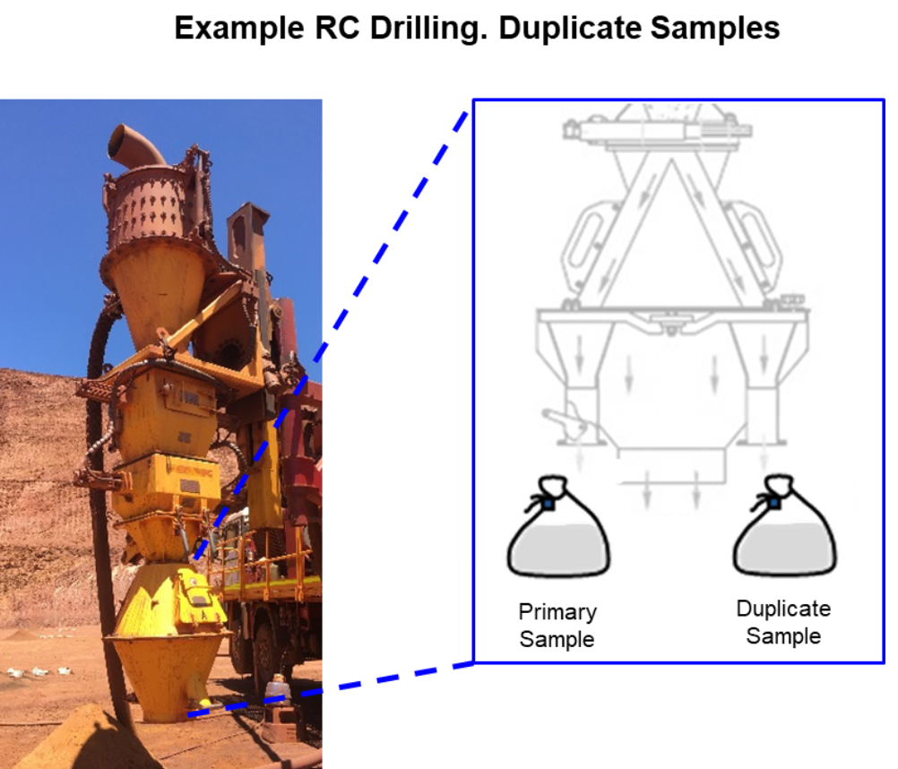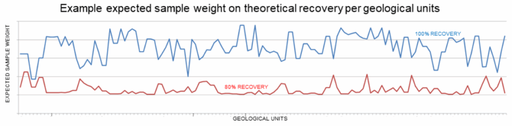 JORC Table 1 provides guidance that drilling campaigns shall deploy measures to maximise sample recovery and representativity. A typical example for a reverse circulation (RC) drilling campaign would be to compare actual sample weights to a theoretical “ideal” drilling recovery, as a function of material density, rod length and diameter, and aperture size of the sample shoot (Figure 3).