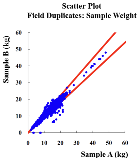Results are commonly presented as in Figure 5, in which a scatter plot shows the distribution of the results between duplicates. In this example, the scatter plot shows differences in weight outside expected thresholds, between 10 kg and 30 kg; and potentially a small bias towards to sample A being heavier than sample B.
