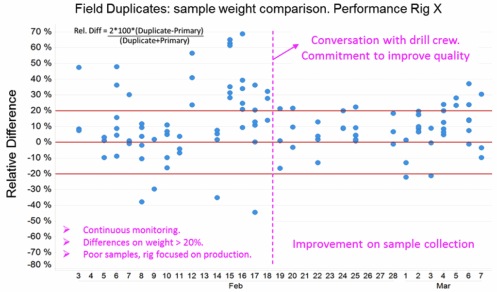 Figure 6 can be interpreted as follows: during the first two weeks of drilling in February, weight differences in rig were not performing within accepted thresholds (Relative Difference ± 20 %). A conversation with the drill crew and drilling company supervisor is conducted in the field to explain to the driller the importance of drilling on geological models, to understand the sources of this poor performance, develop an action plan to improve the sampling practice and obtain a commitment to increase sample quality.