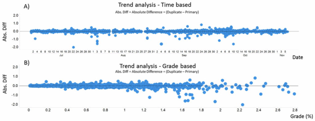 Figure 8 shows an example where a trend analysis is performed both on a time (date) and on a grade basis: A) The Absolute Difference of Duplicate samples is plotted against the date the laboratory has reported the results. The graph does not show major issues over a specific period of time, but if the data is assessed on a grade basis as shown in B), a trend can be in fact be observed and interpreted as the grade of the primary sample being greater than the uplicate sample. The action here will be to talk to the drilling company (if these are field duplicates); or with the team performing the core cutting, or with the laboratory if the data are crusher or pulp duplicates—in order to find the source of this bias, and develop an action plan to fix and close the gap. This real-time assessment and management is the basis for the desired proactive approach. It needs to be highlighted, supplementing reactive activities such as reconciliation results or monthly/quarterly QA/QC reports (if done), where the opportunity for fixing issues in near-real time is lost.