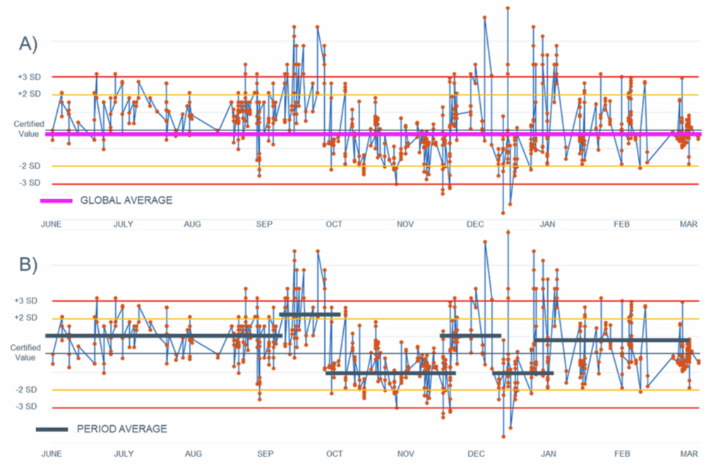 Figure 9 demonstrates the differences between an approach reliant on averages vs QM applied to CRM results (QA = CRMs, QC = ± 3 SD and QM = trend analysis). Figure 9A shows 10-months’ performance of a CRM. Because results have been performing mostly within three standard deviations, the business might infer the process is well controlled and would feel confident, given the global average is close to the certified value.