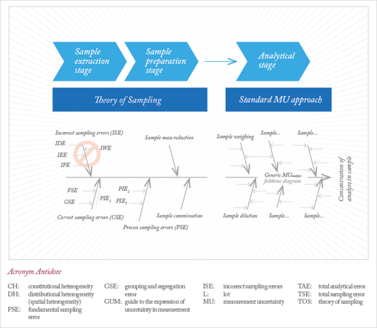 To that end, we call for an integration of TOS with the MU approach, illustrated by Figure 2, which shows three interconnected fishbone diagrams representing sampling, sample preparation and the standard complement of measurement uncertainty sources. Note that the intermediary complement represents the specific sample preparation error types, vividly illustrated and commented upon in a recent article in The Analytical Scientist [16].